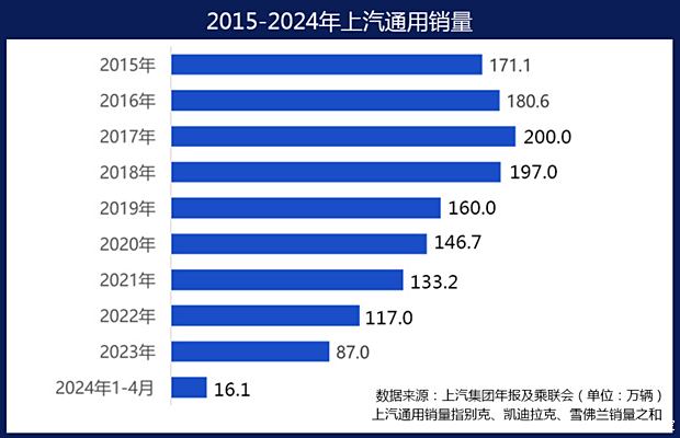 事实上,这家1997年正式成立的合资公司,在2017年站在年销量破200万辆的巅峰后,便急转直下,销量连年下跌。上汽通用在快速扩张期布置的190多万辆的产能(财报数据),在市场调整期变成一种负担。