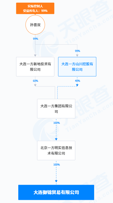 天眼查数据显示,一方集团100%控股大连御锦,前者董事长为孙喜双,他于2001年创建一方集团,与万达集团、江中集团、百年人寿等众多中国知名企业长期合作,并成为其战略投资者。