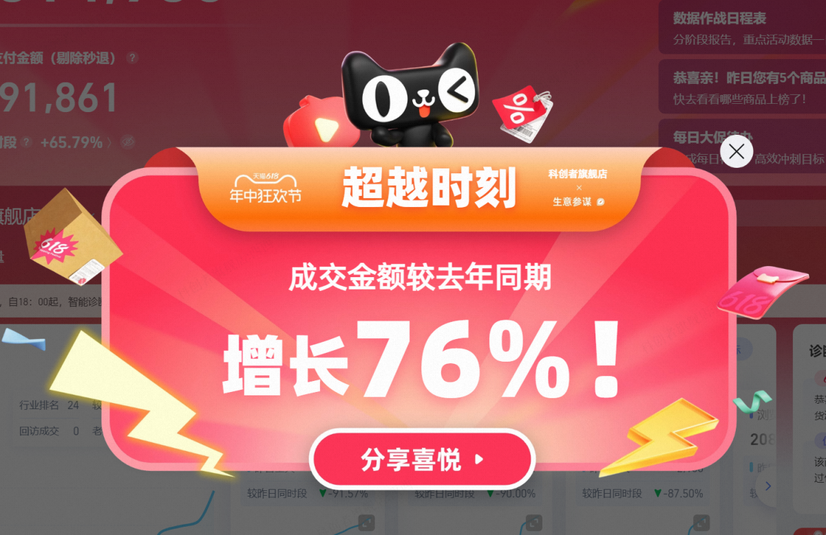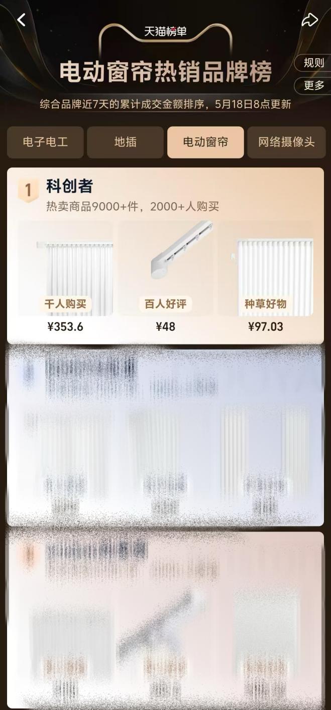 作为智能家居赛道的标杆品牌,科创者在 618 抢先购阶段即展现出碾压级优势。数据显示,其天猫旗舰店首日销售额突破 1000+万元,同比增长 76%,单品销量占天猫平台电动窗帘总交易量的 52%。