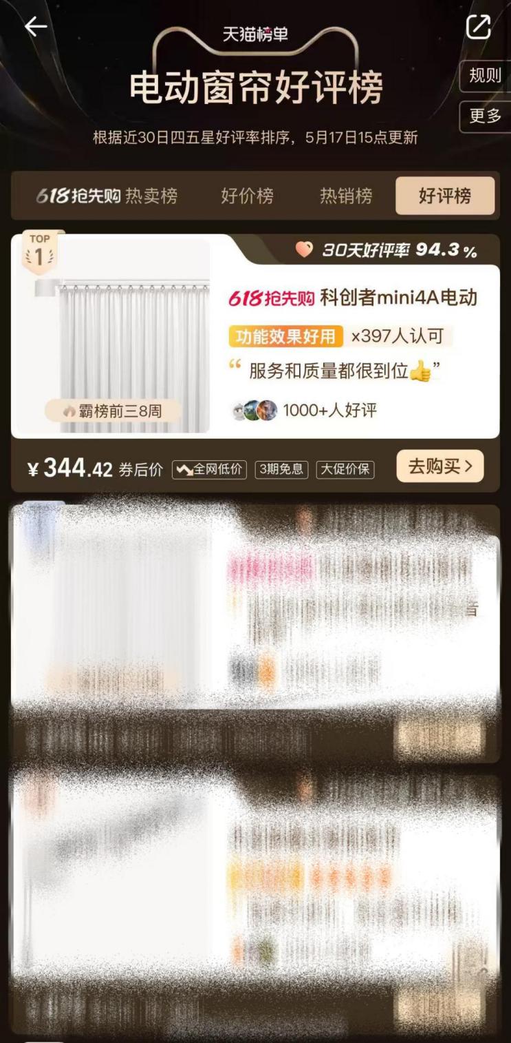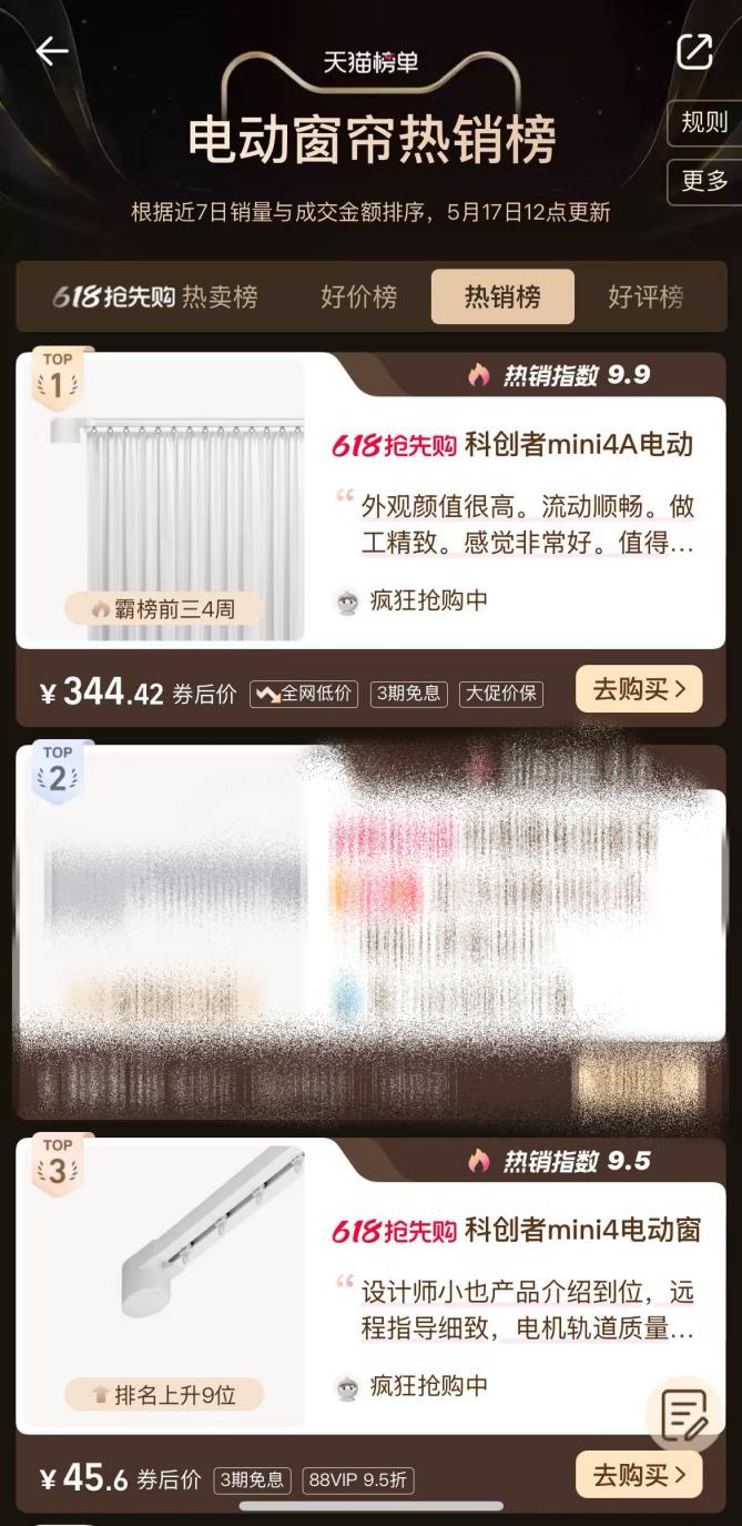 (原标题:科创者智能窗帘 2025年618 横扫天猫三榜,明星主播力荐掀起抢购狂潮!)