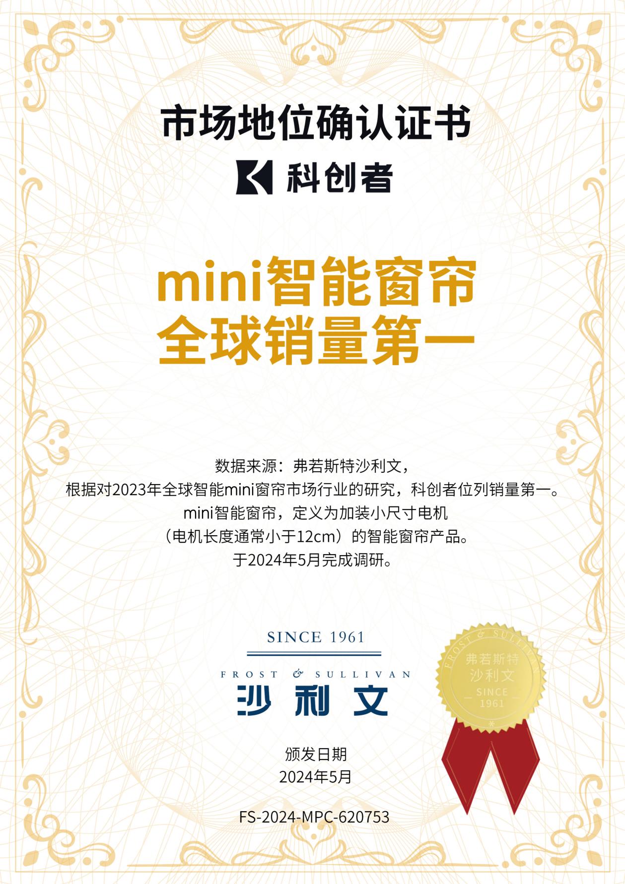 科创者的行业地位获得国际权威机构与主流媒体的双重背书。2023 年,弗若斯特沙利文向其颁发 “mini智能窗帘全球销量第一” 认证证书;