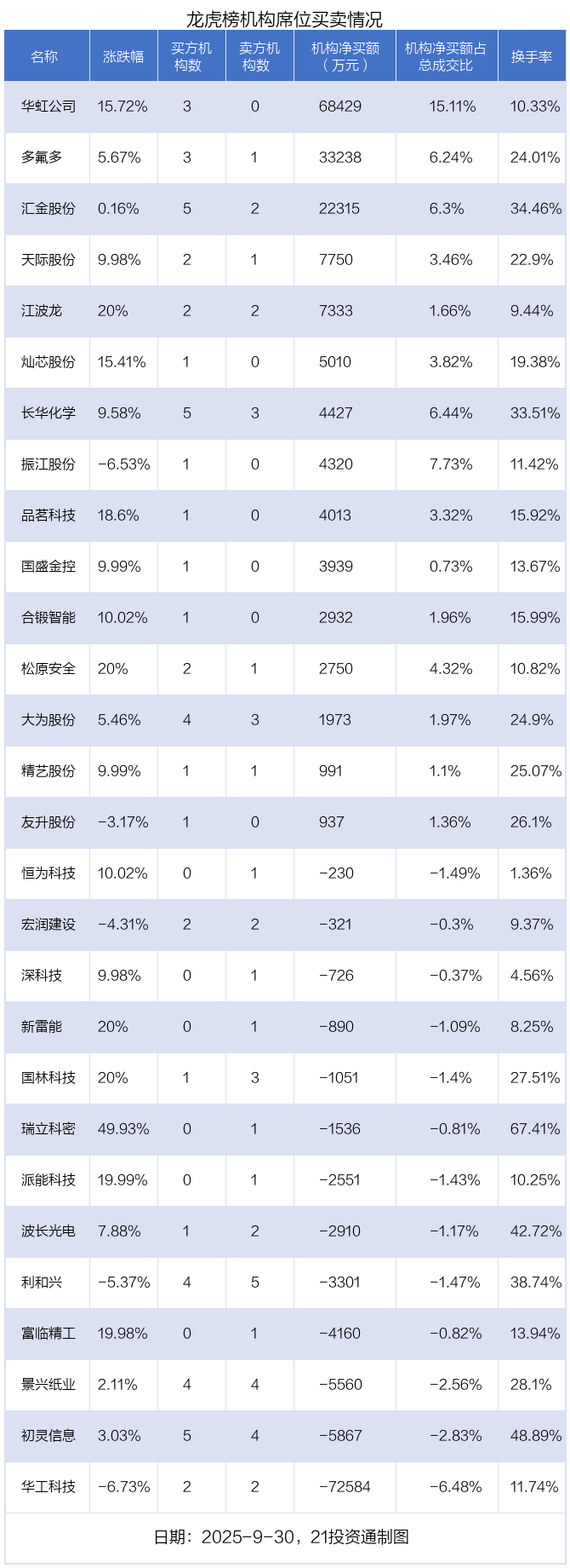 9月30日,28只个股龙虎榜出现了机构的身影,机构合计净买入6.87亿元。具体来看,机构净买入15股,净卖出13股。