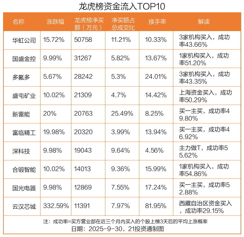 9月30日,上证指数上涨0.52%,深证成指上涨0.35%,创业板指下跌0%。盘后龙虎榜数据显示,共有46只个股因当日异动登上龙虎榜,资金净流入最多的是华虹公司(688347.SH),达5.08亿元。