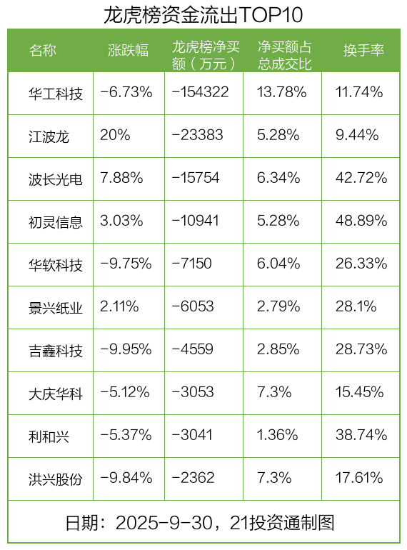 而龙虎榜中资金净流出最多的是华工科技(000988.SZ),被净卖出为15.43亿元,占总成交金额的13.78%。华工科技收盘下跌6.73%,换手率为11.74%。