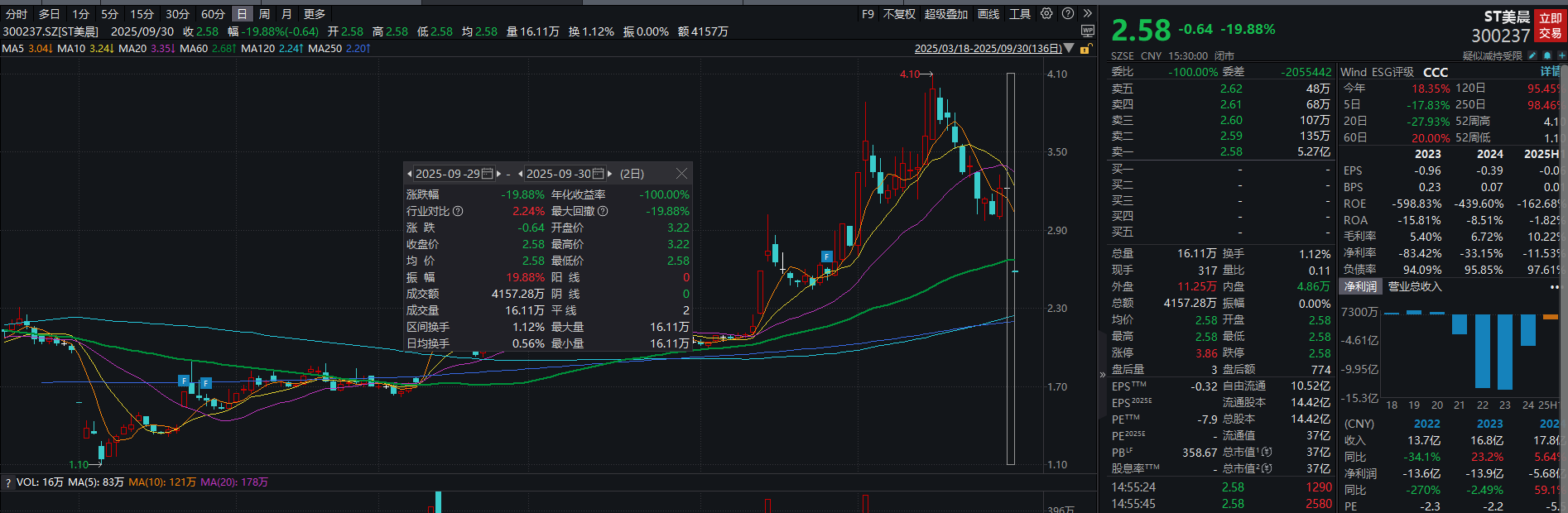 二级市场方面,9月30日,ST美晨在复牌当日一字跌停,截至收盘下跌19.88%,股价报2.58元/股,总市值37亿元。
