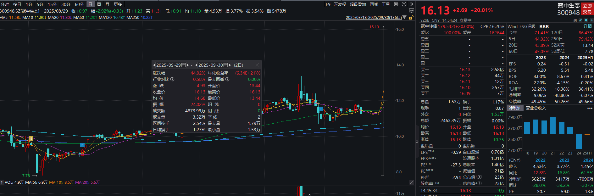 二级市场方面,冠中生态自9月29日复盘后,连续收获2个20CM一字板,累计涨幅达44.02%,截至9月30日收盘,股价报16.13元/股,总市值23亿元。