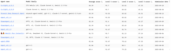 作为评估通用AI智能体综合能力的权威基准,由Meta、Hugging Face与AutoGPT联合发布的GAIA榜单,采用封闭测试集与自动评分机制,结果可复现、可审计,已被多家顶尖机构与国际会议广泛引用。近日,在最新GAIA 评测基准榜单中,中兴通讯开源的“Co-Sight超级智能体2.0”再次以84.39%的综合成绩位列全球第一,成为首个登顶该榜单的中国超级智能体。