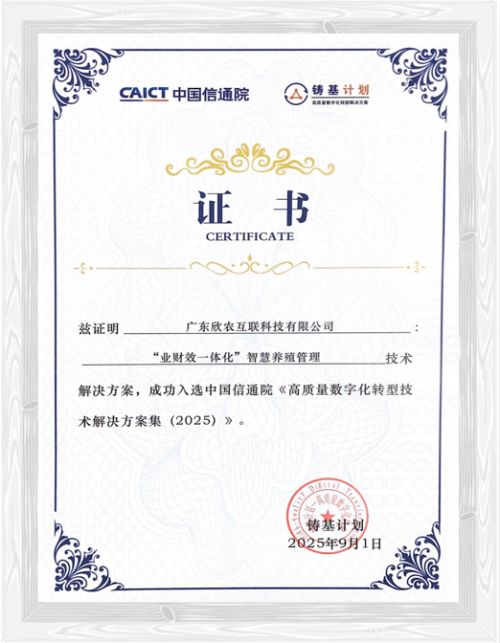 “铸基计划”是由中国信息通信研究院发起,核心目标是筛选数字化转型领域的标杆产品与服务,为各行业数字化升级提供权威参考,为数字经济高质量发展筑牢根基。作为国家级权威机构,信通院的认证标准严格对标行业最佳实践与前沿技术,此次将三项荣誉授予欣农互联,不仅是对企业技术实力与产品创新的高度肯定,更标志着欣农互联在智慧养殖赛道的领先地位得到官方认可。