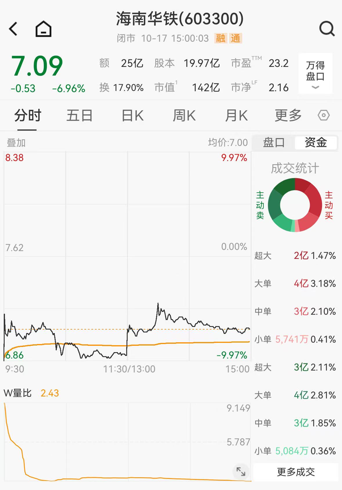 截至10月17日收盘,海南华铁股价报7.09元/股,跌近7%,总市值为142亿元。