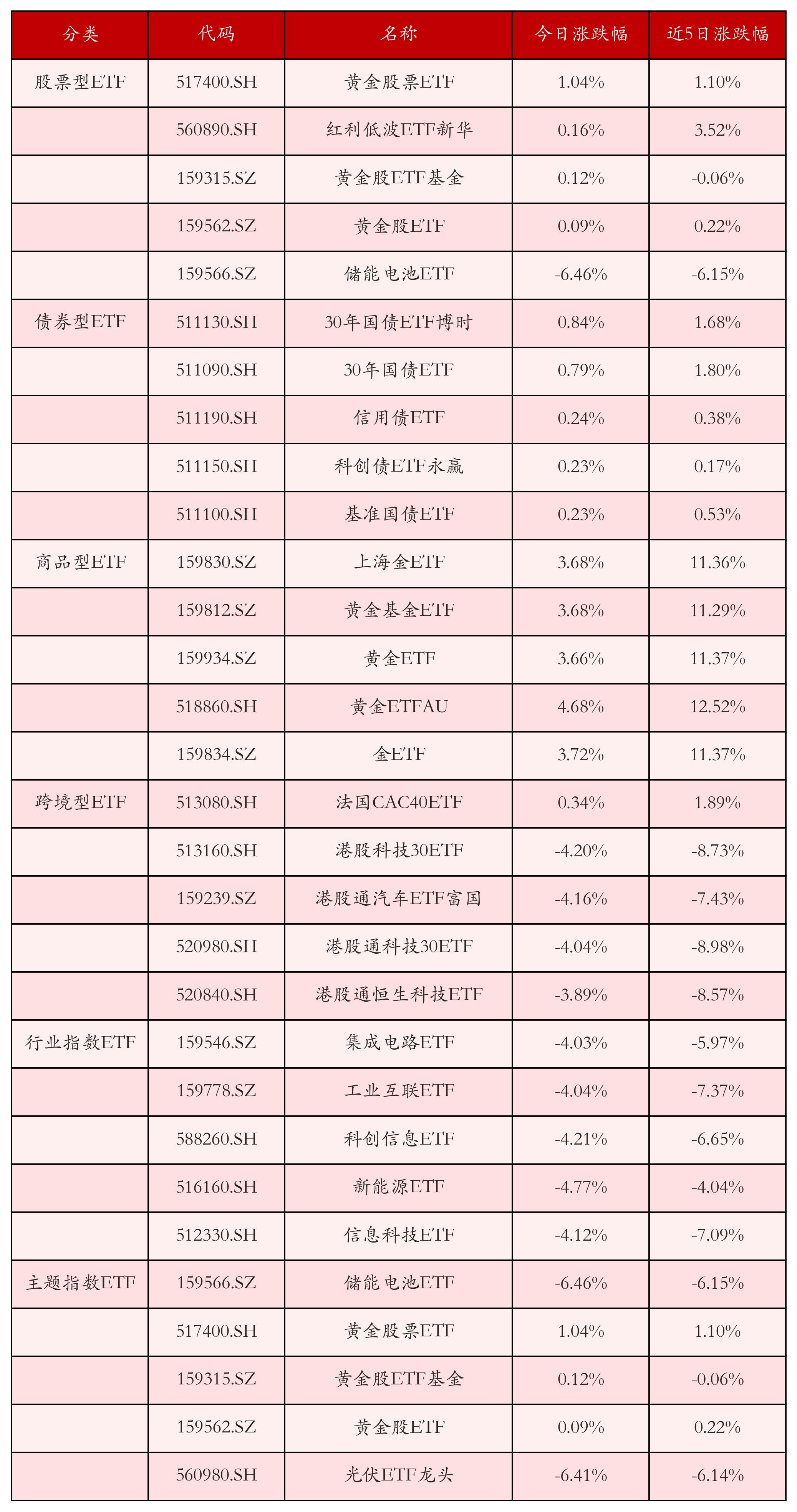 从不同投资种类、行业、主题的ETF产品中找出今日走势行情排名前5的ETF基金,今日涨幅靠前的ETF产品如下表所示。股票型ETF中涨跌幅排名前3位的ETF产品分别为黄金股票ETF(517400.SH)、红利低波ETF新华(560890.SH)和黄金股ETF基金(159315.SZ),今日收益率分别为1.04%、0.16%和0.12%。