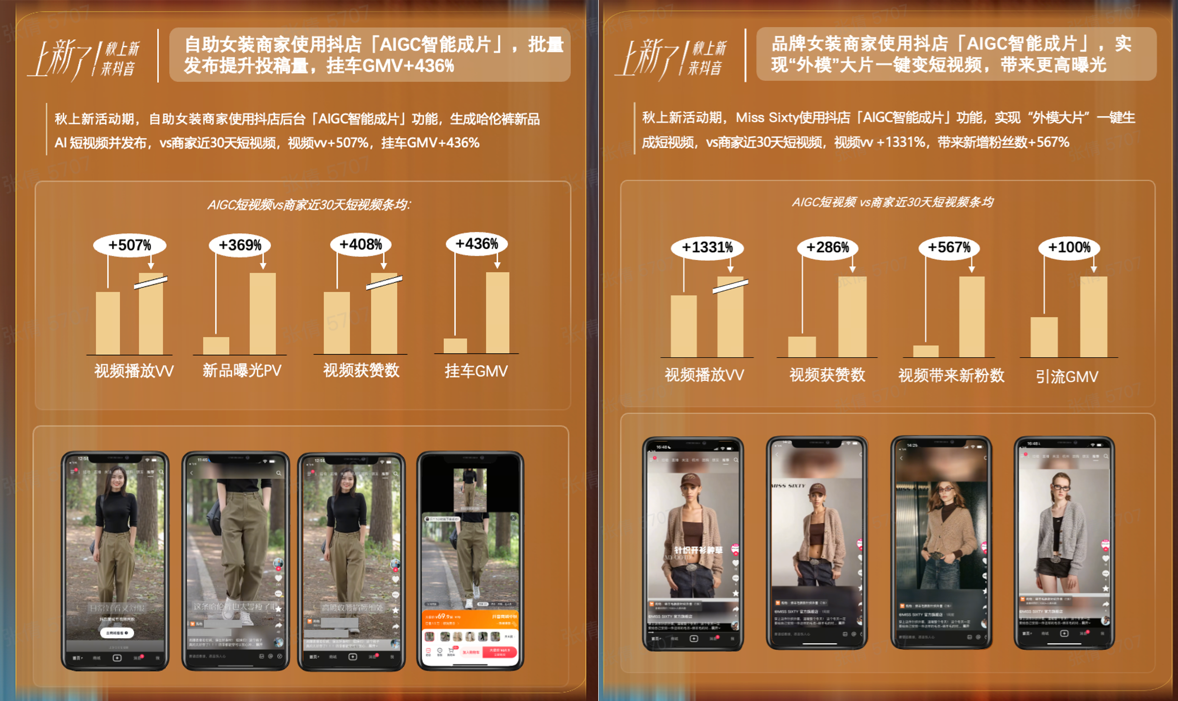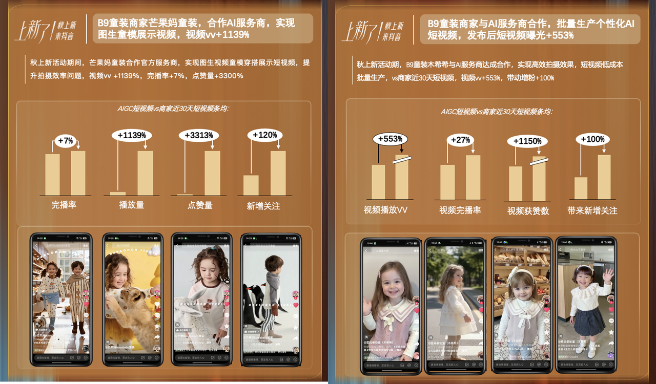 抖音商城「秋上新」还挖掘多个AI服务商,提供更个性化的AI制作服务,帮助商家批量生成优质素材。其中AI挂车短视频效率更好,日均播放量增长465%,日均GMV接近翻倍,关注次数增长606%。