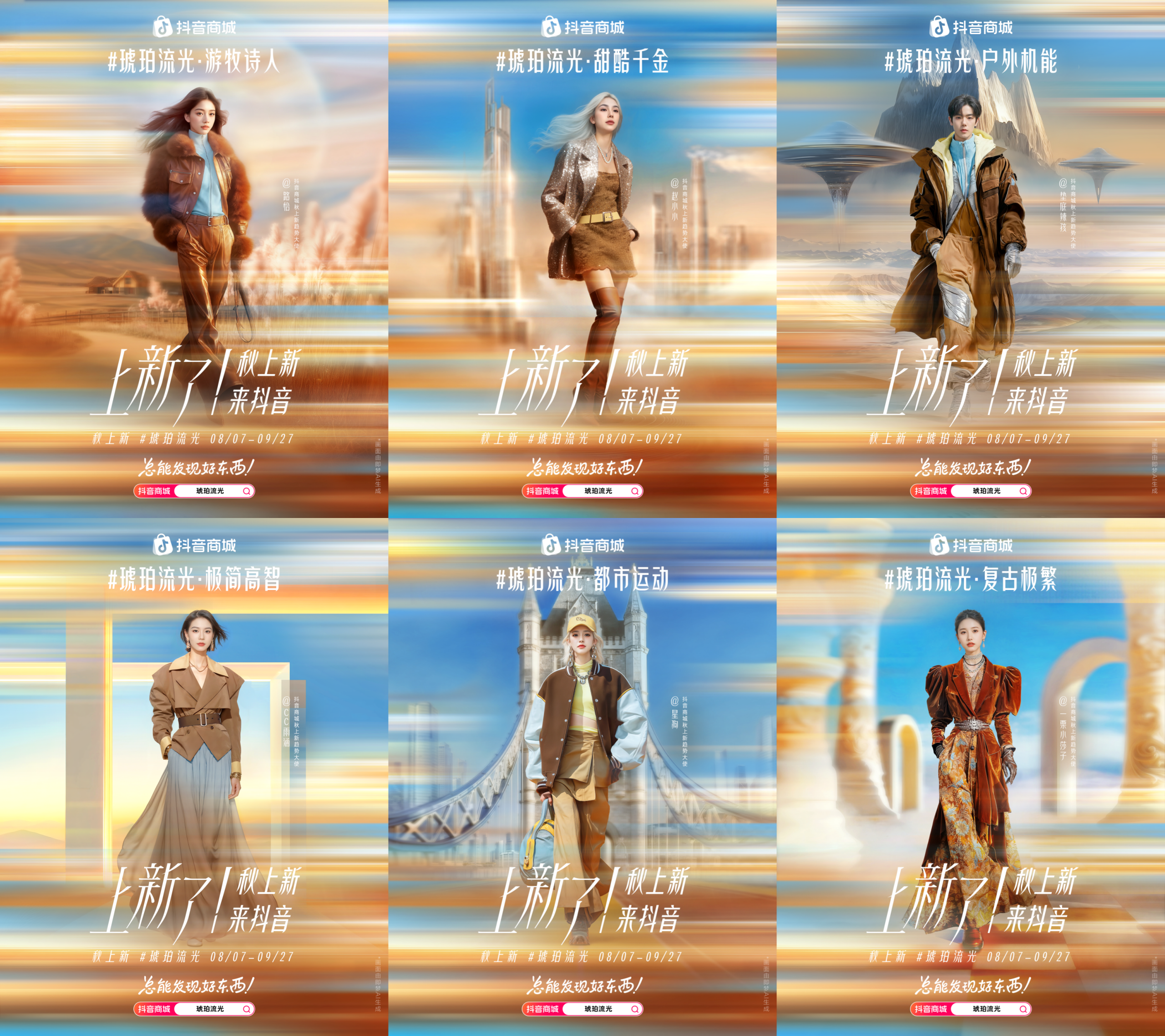 8月7日立秋之际,抖音商城联合Pantone、WGSN发布趋势「琥珀流光」,其灵感源自Shimmer Core,意为“微光、闪烁”,主张在大地色系、棕色系为主的沉稳基调上巧添明亮点缀或细闪,为秋冬时尚注入生机与疗愈的精神内核。