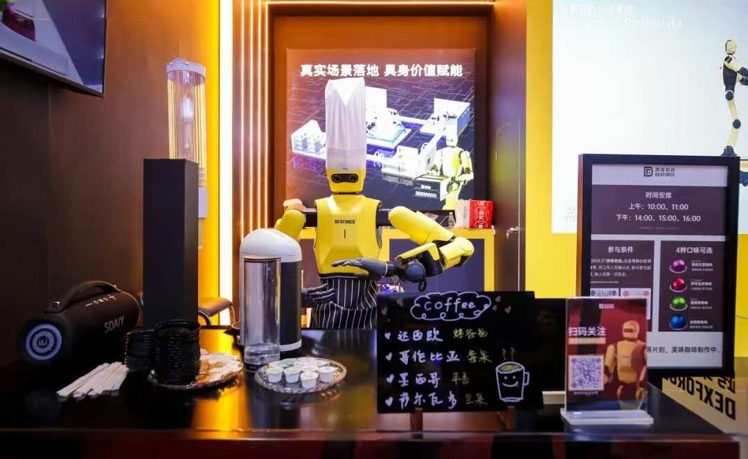 跨维智能机器人DexForce W1 Pro在世界人工智能大会上展示制作咖啡。