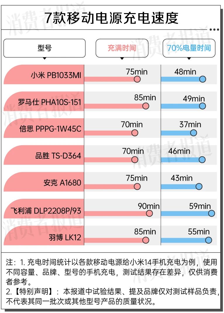 需要注意的是,充电时间仅统计各款移动电源给小米14手机充电的情况。实际使用中,移动电源给不同容量、品牌、型号的手机充电,测试结果存在较大差异。此次测试具有一定主观性,仅供消费者参考。