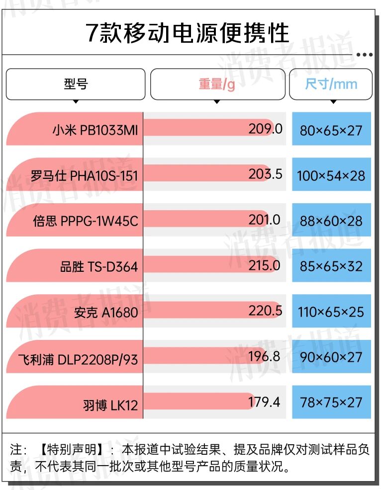 “双十一”又来了,正值大家选购心头好之际。为了解答以上有关移动电源的疑问,近期《消费者报道》选购了市面上销量较高的7款移动电源(电池容量均为10000mAh),集中进行了使用体验。品牌及产品型号包括小米PB1033MI、罗马仕PHA10S-151、倍思PPPG-1W45C、品胜TS-D364、安克A1680、飞利浦DLP2208P/93、羽博LK12。