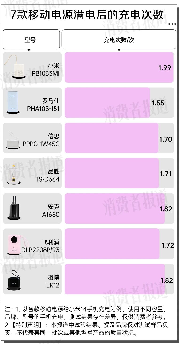 哪款移动电源给手机的充电次数更多呢?测试员用7款移动电源给小米14手机进行充电,从0%电量充满到100%电量的时间算1次,如果第2次充电到70%时电量耗尽,算1.70次。