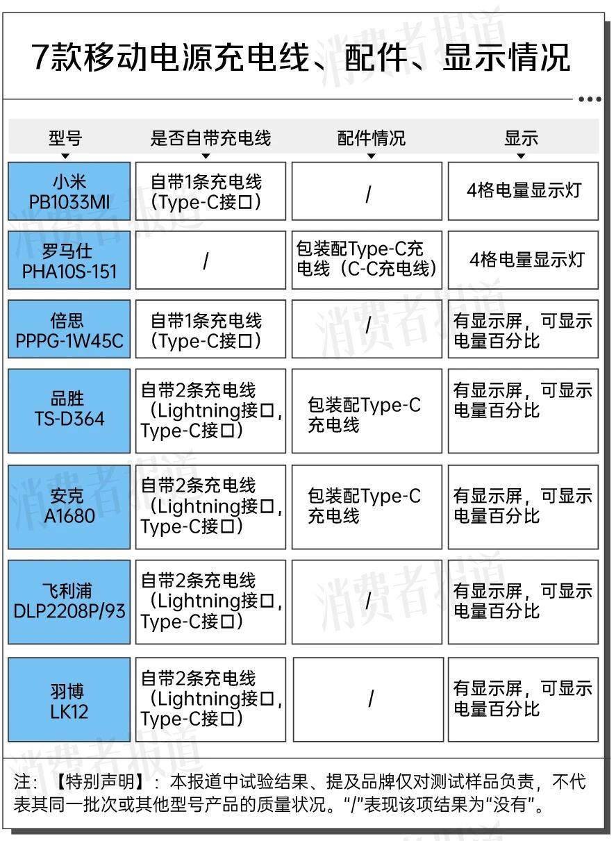 另外,《消费者报道》记者对7款移动电源的接口、充电线情况也进行了统计,见下表。