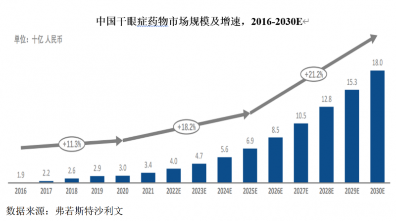 除了干眼症之外,以近视等为代表的眼科疾病伴随着电子产品的普及而广泛蔓延,素有“金眼银牙”之称的眼科医疗赛道也愈显火热,据弗若斯特沙利文测算,2025年中国眼科药物市场将达440亿元,并将于2030年将攀升至1,084亿元。