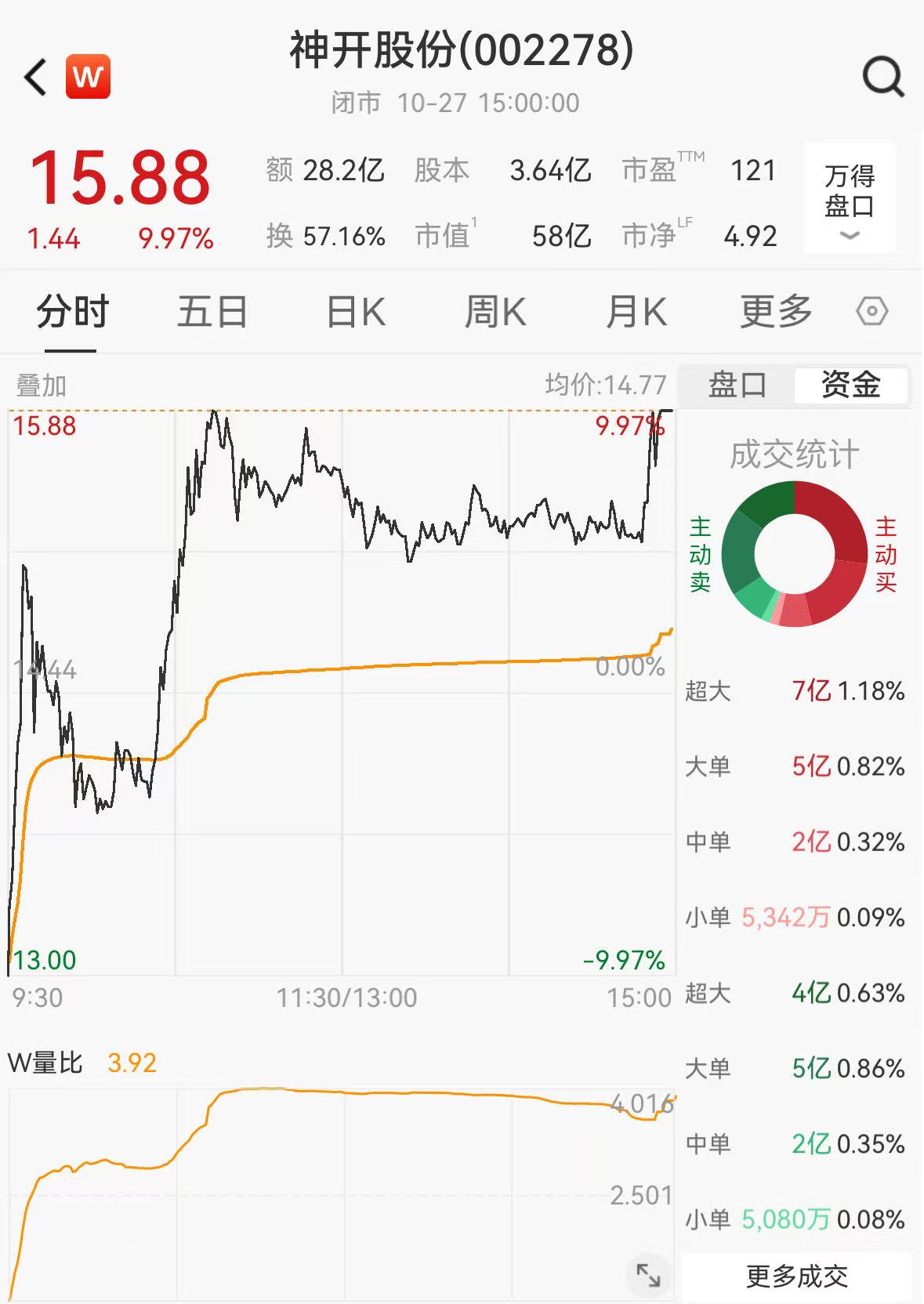 10月27日,神开股份(002278.SZ)开盘跌停,随后震荡走强,并最终以涨停价收盘,上演“地天板”。截至收盘,报15.88元/股,成交额28.20元,换手率超57%。自10月20日以来,神开股份股价在6个交易日内已涨超70%,创下近8年来新高。