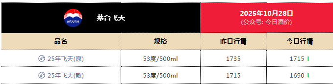 10月28日,酒类行情监测平台“今日酒价”数据显示,2025年53度500ml飞天茅台散瓶批发参考价报1690元,较前一日下跌25元,首次跌破1700元/瓶大关,再创上市以来的新低;原箱报1715元,较前一日下跌20元。两款产品较上线时的2220元、2255元累计跌幅均已超过31%。