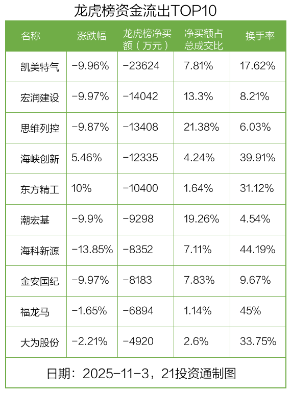 而龙虎榜中资金净流出最多的是凯美特气(002549.SZ),被净卖出为2.36亿元,占总成交金额的7.81%。凯美特气收盘下跌9.96%,换手率为17.62%。