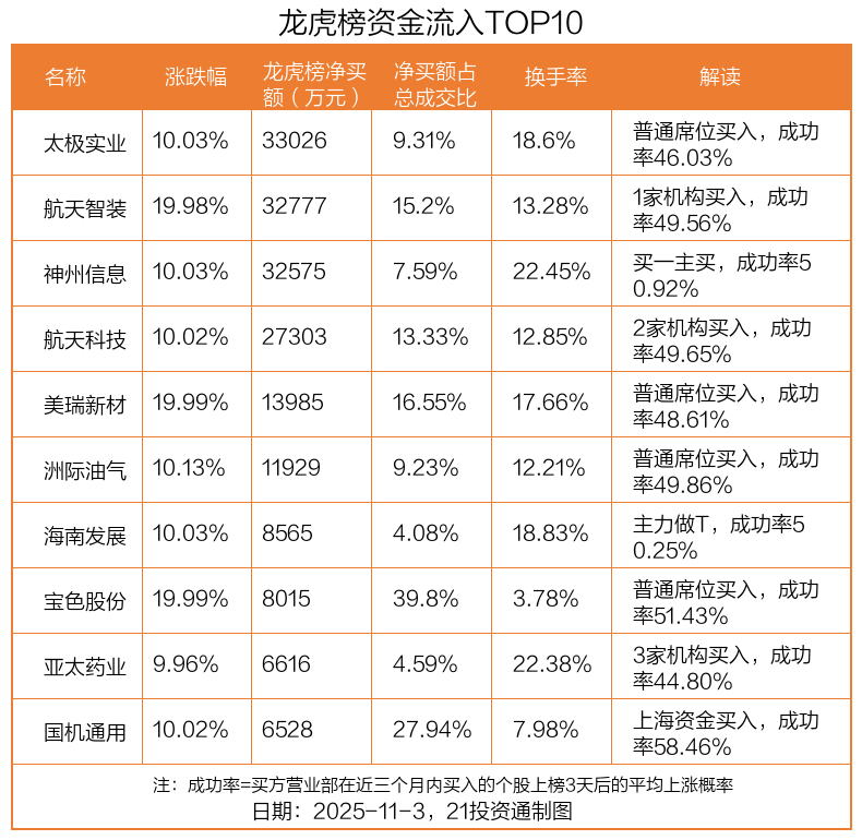 11月3日,上证指数上涨0.55%,深证成指上涨0.19%,创业板指上涨0.29%。盘后龙虎榜数据显示,共有47只个股因当日异动登上龙虎榜,资金净流入最多的是太极实业(600667.SH),达3.3亿元。