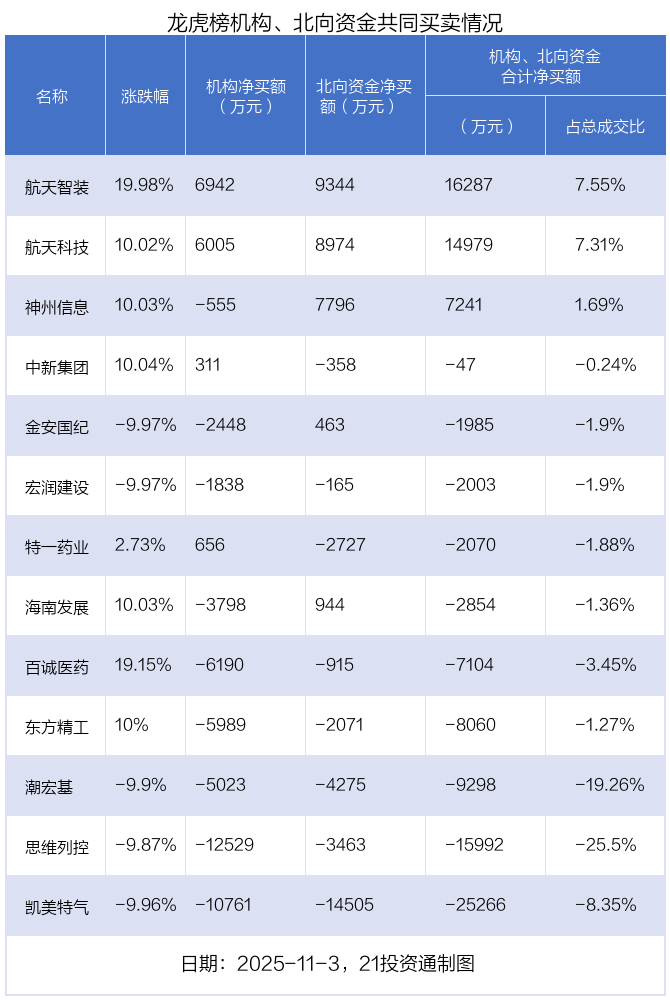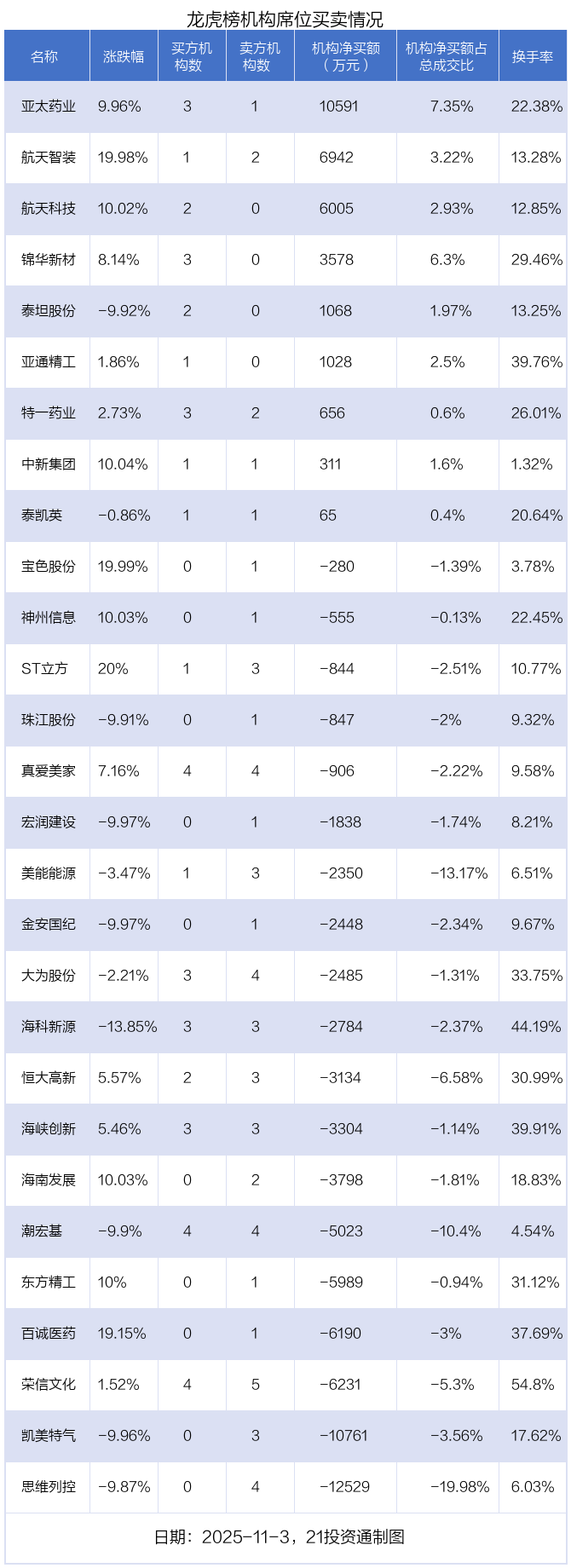 11月3日,28只个股龙虎榜出现了机构的身影,机构合计净卖出4.21亿元。具体来看,机构净买入9股,净卖出19股。