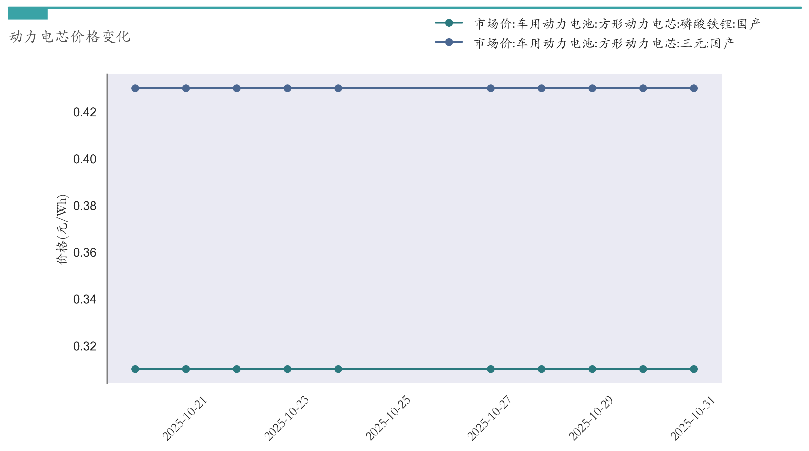 截至10月31日,方形动力电芯(磷酸铁锂)市场报价为0.31元/Wh,较10月24日持平。方形动力电芯(三元)市场报价为0.43元/Wh,较10月24日持平。近两周动力电芯价格变化如下图所示: