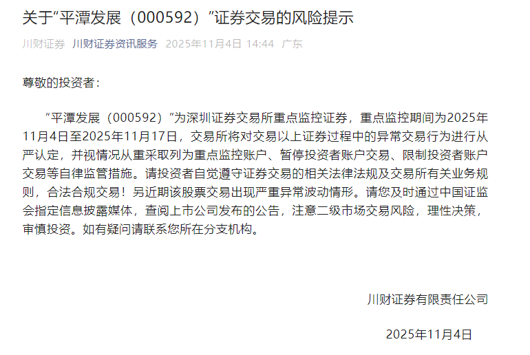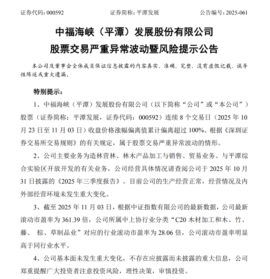 根据平潭发展11月3日公告,公司股票连续8个交易日(2025年10月23日至11月03日)收盘价格涨幅偏离值累计偏离超过100%,根据《深圳证券交易所交易规则》的有关规定,已纳入严重异动股票名单。公司还在公告中表示,其滚动市盈率明显高于同行业水平,也不存在基本面重大变化或应披露而未披露的重大信息,提醒广大投资者注意投资风险。