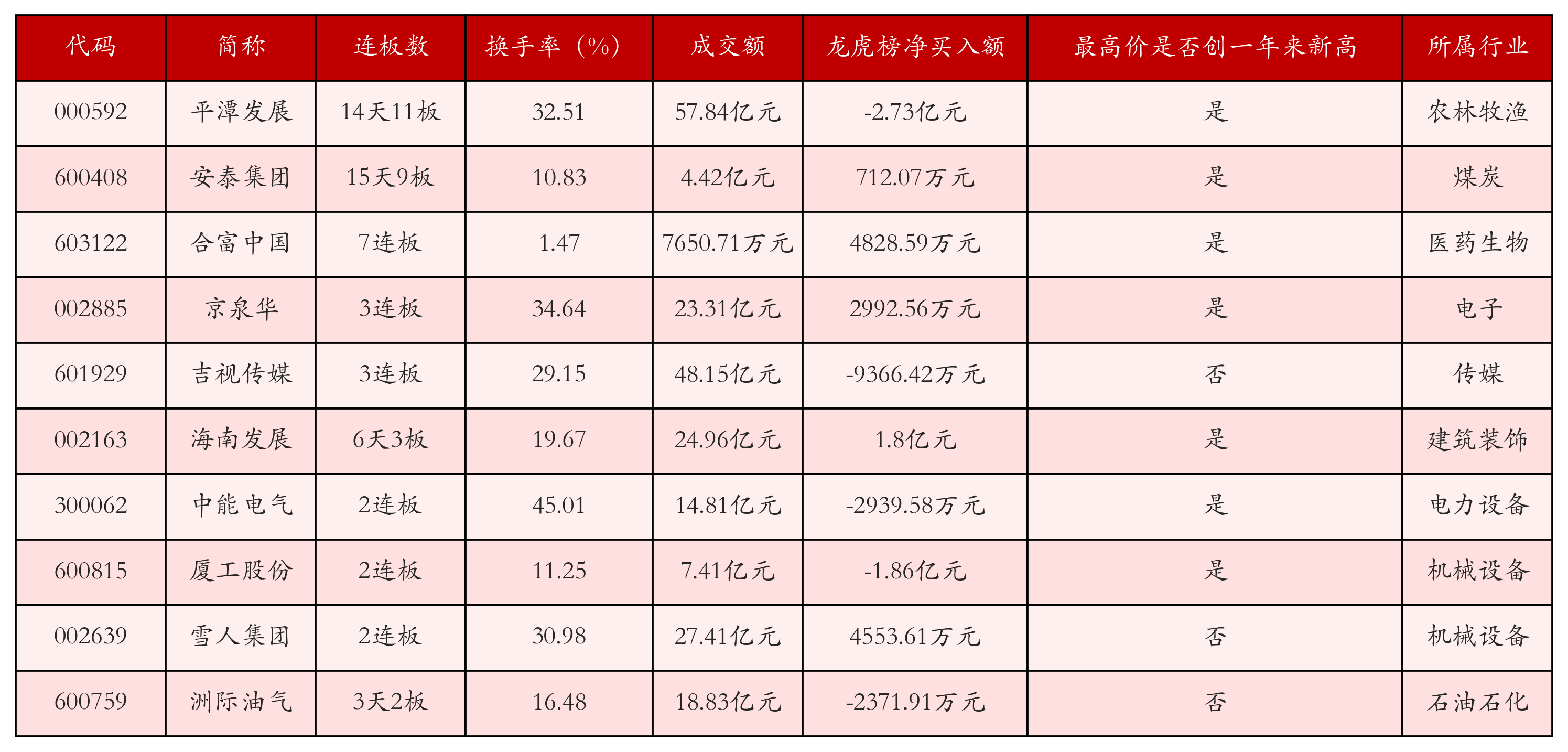 截至11月5日收盘,上证综指上涨0.23%,收于3969.25点,深证成指上涨0.37%,收于13223.56点,创业板指上涨1.03%,收于3166.23点。今日沪深两市A股共计82只涨停,综合当前连板数以及当日龙虎榜数据,其中较为强势的前三只个股分别为:平潭发展(000592)、安泰集团(600408)与合富中国(603122)。今日强势个股前10位具体数据见下表: