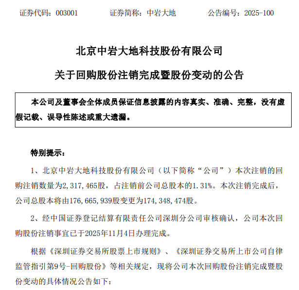 11月6日,中岩大地(003001)发布关于回购股份注销完成及股份变动的公告。公司此前在2023年和2024年两次回购的拟出售股份中,经2025年9月的决策调整,将其中231.7465万股(占注销前总股本的1.31%)用途变更为注销,并于11月4日顺利完成注销手续。此次注销比例在A股市场中较为显著,是行业内少有的大比例注销实践,充分展现了公司回报股东、优化资本结构的决心。