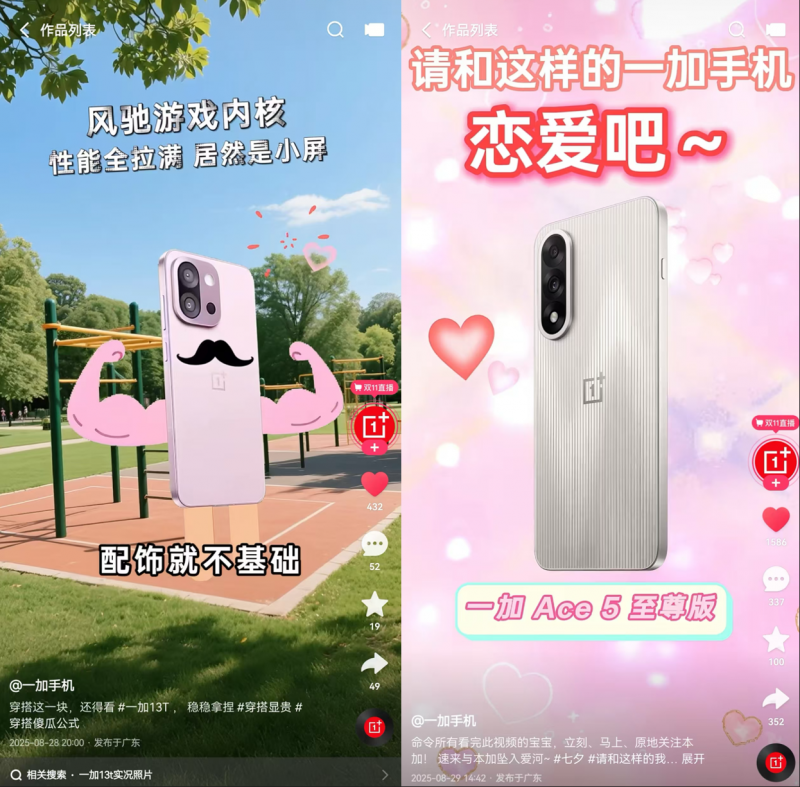 在内容上,一加针对“性能Ultra旗舰”、“165Hz第三代东方屏”、“7300mAh超大电池”等新品核心卖点,打造优质短视频并进行矩阵通发,扩大品牌新品势能,吸引用户关注。同时,品牌还基于对平台用户消费偏好的洞察,在产品展示、产品功能讲解等新品内容素材的基础上,进行差异化处理,强调大促期间新品的快手独家权益、补贴政策、优惠额度,快速引爆新品内容热度,抢占用户消费心智。