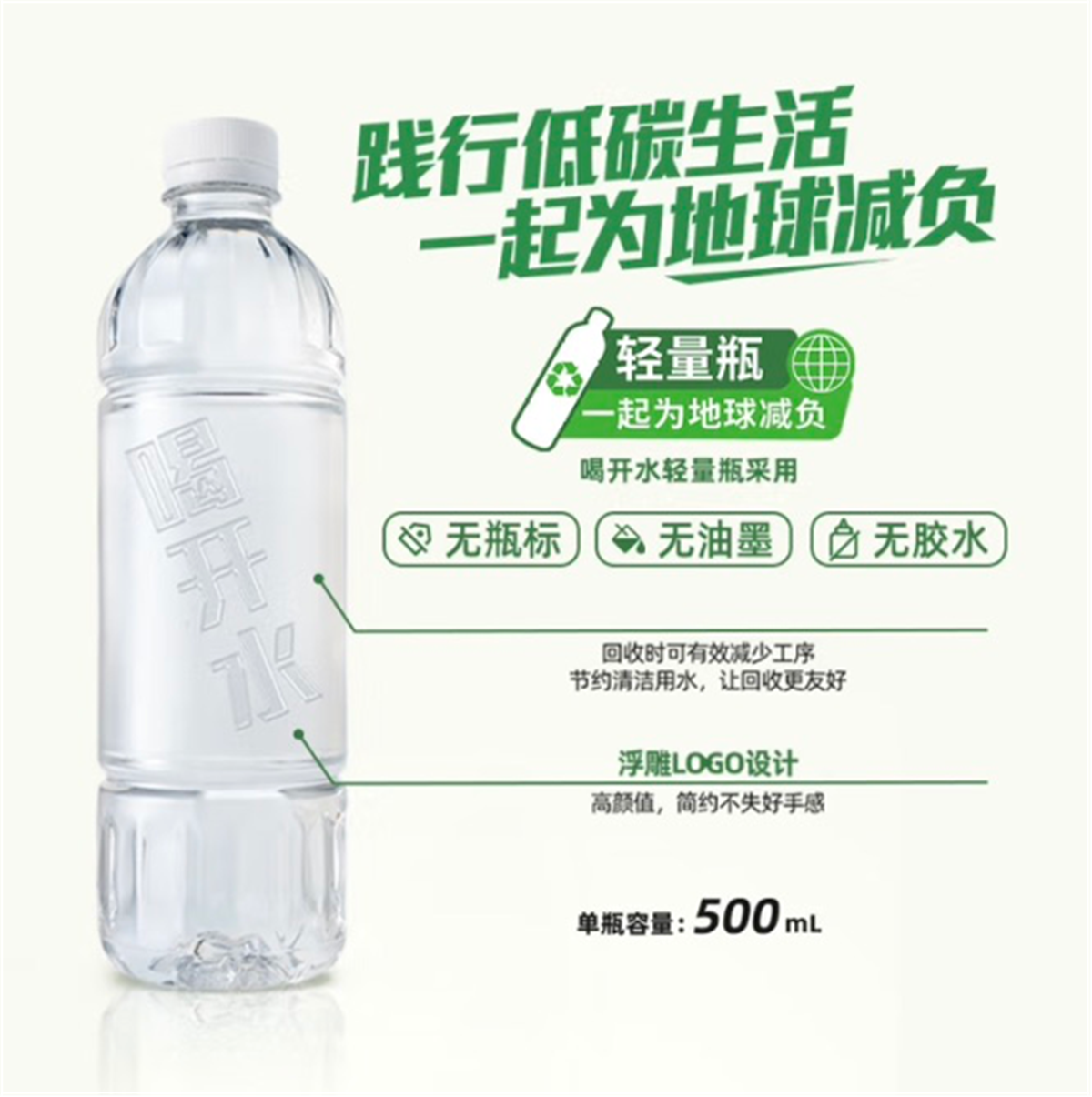 在此背景下,康师傅喝开水推出的“无标签”轻量瓶,正是对这一理念的前沿响应。产品明确主打“三无”设计——无瓶标、无油墨、无胶水,将环保理念贯穿于包装全环节,使可持续消费变得直观可感。