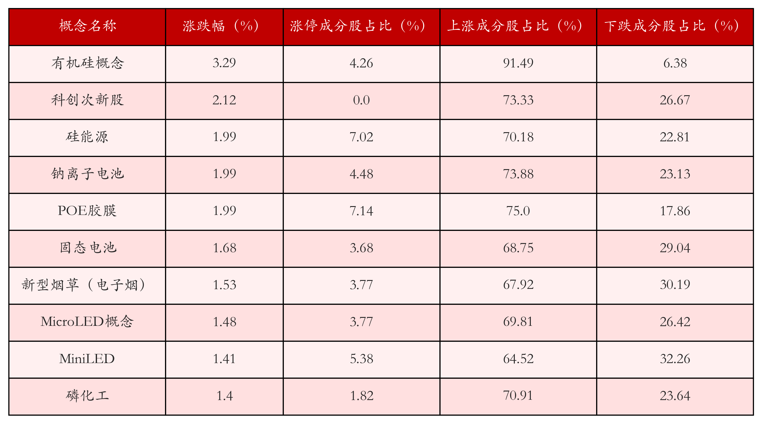根据A股概念涨跌幅与所对应的股票池综合分析,涨幅靠前的三个概念板块分别为:有机硅概念、科创次新股与硅能源。排名前10位的概念板块相关数据见下表: