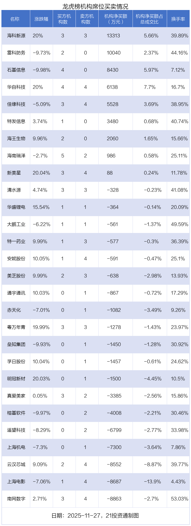 其中,机构净买入金额最多的是海科新源(301292.SZ),当日收盘上涨20%,换手率为39.89%。