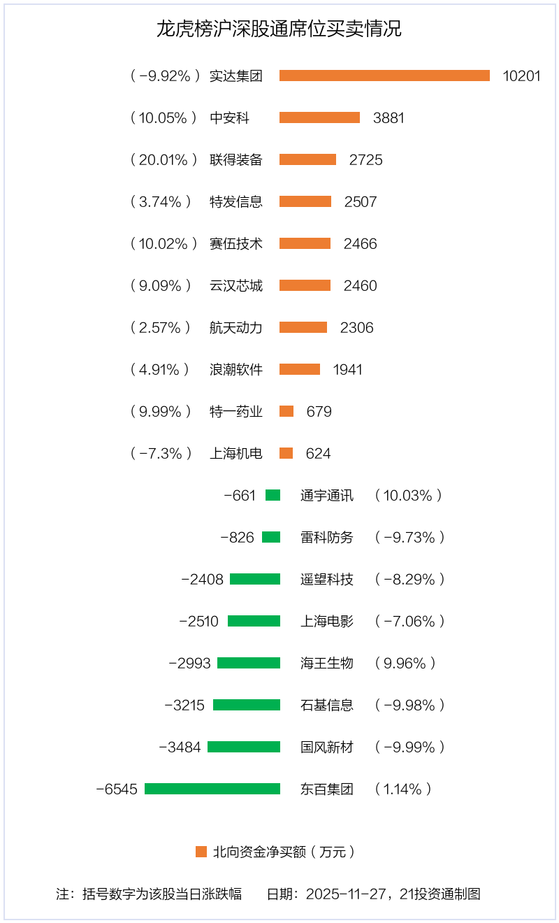 11月27日,北向资金参与龙虎榜中的个股共有18只,合计净买入7145.69万元。其中沪股通净买入6 股,净卖出2 股,合计净买入1.24亿元;深股通净买入4 股,净卖出6 股,合计净卖出5217.06万元。