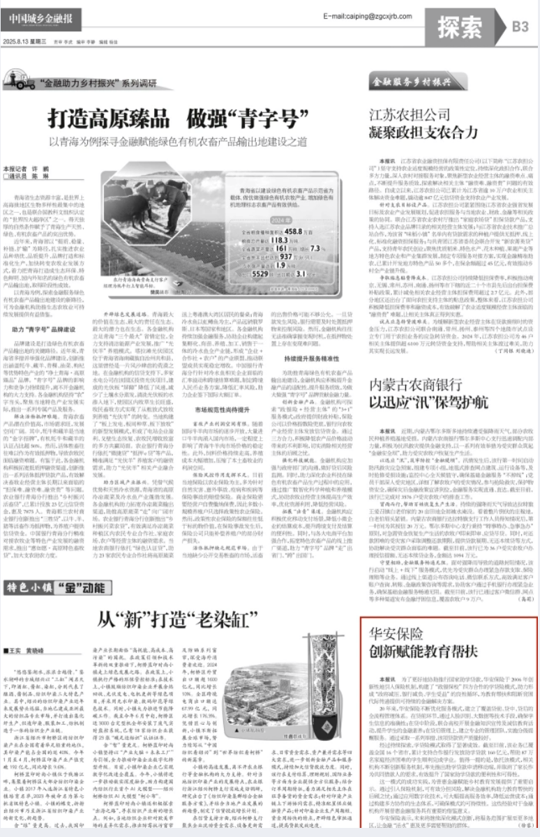 本次入选的《创新赋能教育帮扶》案例,已被主办方列为优秀实践案例并在《中国城乡金融报》刊发,报道展现了华安保险在融合保险机制与教育帮扶、助力乡村发展方面的有效探索与务实成果。