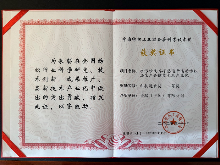 11月28日,2025年度中国纺织工业联合会科学技术奖励大会在北京人民大会堂举行,会上表彰了2025年度中国纺联科学技术奖。安踏儿童与武汉纺织大学等共同合作的“冰溶纱”及其凉感速干运动纺织品生产关键技术及产业化项目,荣获“中国纺织工业联合会科学技术进步奖 二等奖”。