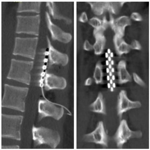 经过全面细致的评估,团队判断该患者仍具备较好的神经功能恢复潜力,遂为其制定了“脊髓电刺激(SCS)植入术”治疗方案。手术于胸11-腰1节段成功植入片状电极,术中电生理监测反应良好,术后患者恢复顺利。令人欣慰的是,在首次启动刺激后,患者立即感受到微电流传向下肢,提示神经调控已初步起效。