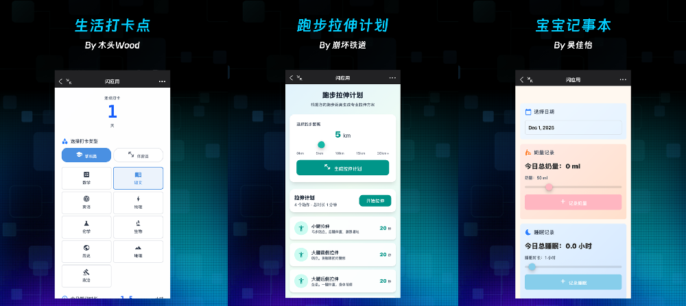 (图说:灵光用户创建的闪应用—生活打卡器、跑步拉伸计划、宝宝记事本)