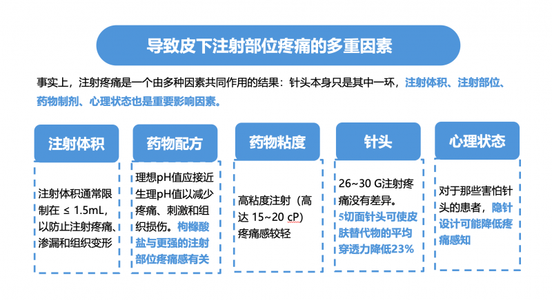 皮下注射部位疼痛主要与注射体积、配方、物粘度、针头、心理状态等因素有关:
