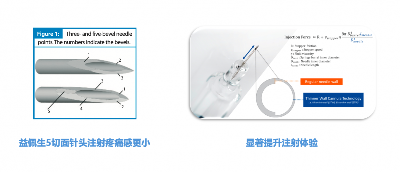 针头规格(外径)不是决定疼痛感的唯一因素,针尖斜面设计、润滑涂层、针座几何形状等先进技术对改善注射体验起决定性作用。有研究表明,针头在 26-30G范围内,注射疼痛没有差异。益佩生采用了美国碧迪公司(BD)先进的27G 5切面针头,与传统的3切面针头相比,针尖刺入皮肤所需力度(平均穿透力)降低23%,显著降低注射疼痛。