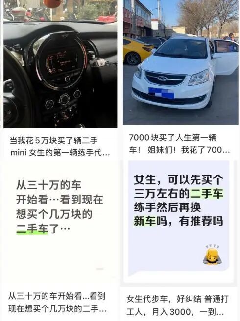 “恭喜06年大学生喜提04年奥迪”“02年女生一万多拿下二手车”……