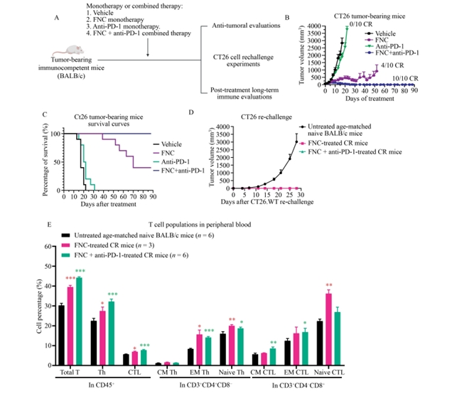 在CT26结肠癌小鼠模型中,联合疗法展现出显著优于单药的疗效:联合治疗组全部小鼠在39天内实现肿瘤完全消退,且至第88天随访结束无一例复发。特别值得关注的是,在后续的“再挑战”实验中,经联合治疗痊愈的小鼠在重新接种同种肿瘤细胞后未发生肿瘤生长,证实该方案可诱导强大的免疫记忆,为克服肿瘤复发与获得性耐药提供了直接证据。