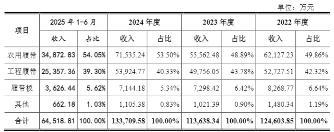 根据应用领域划分,元创股份的主营产品可分为农用履带、工程履带和履带板三大类。其中,农用履带与工程履带凭借应用场景广泛、产品体型大、单价高的特点,成为公司主营业务收入的重要组成部分。2025年上半年,这两类产品分别实现收入3.49亿元、2.54亿元,合计营收占比超九成,高度聚焦的业务布局为公司的长期稳定发展奠定了基础。