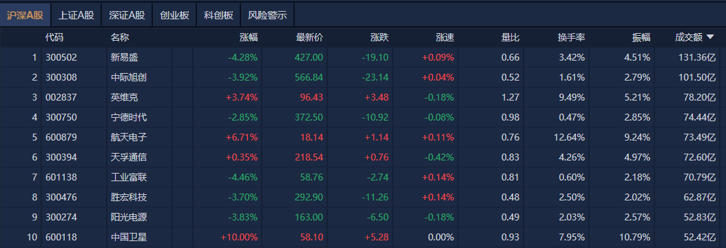 个股方面,新易盛成交额超131亿元居首,中际旭创、英维克、宁德时代成交额靠前。