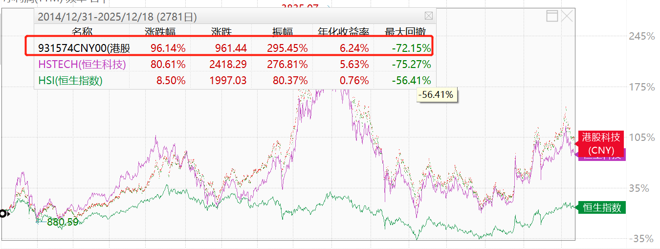 覆盖“中国十大科技股”(阿里巴巴、京东集团、吉利汽车、比亚迪股份、小米集团、腾讯控股、网易、百度集团、美团和中芯国际)的港股科技指数(931574)相对恒生科技指数表现更优。Wind数据显示,港股科技指数(CNY)自基日2014年12月31日至2025年12月18日,累计涨幅96.14%,同期恒生科技指数涨幅80.61%。