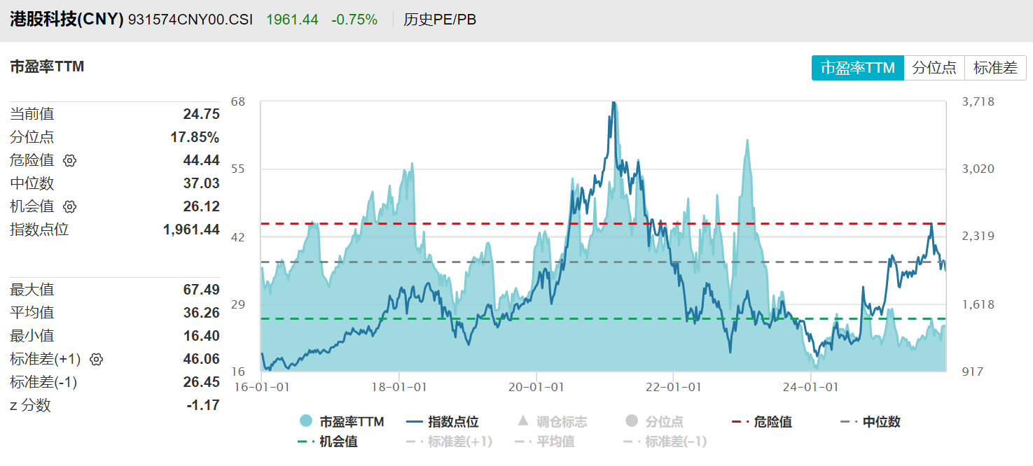 Wind数据显示,截至12月18日,港股科技50ETF(159750)跟踪的港股科技指数最新估值24.75倍PE-TTM,位于10年来的18%历史分位点,整体处于较低区域,相比纳斯达克指数(41倍)、创业板指(40倍)性价比显著。