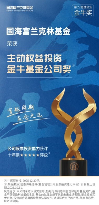 12月30日,由《中国证券报》主办的“2025公募基金高质量发展大会”在上海举行,同步揭晓第二十二届基金业金牛奖评选结果。国海富兰克林基金管理有限公司凭借长期稳健的经营管理,领先的投资管理实力,与注重基民获得感的使命担当,荣获“主动权益投资金牛基金公司奖”、“长期回报金牛奖”两项重磅大奖。