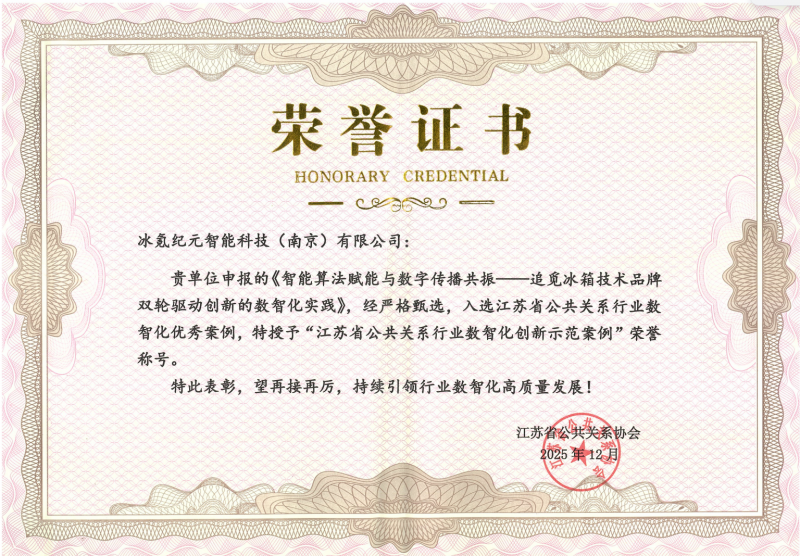 (原标题:冰氪纪元入选江苏省公共关系行业数智化标杆单位,追觅冰箱创新实践荣获“数值化创新示范案例”称号)